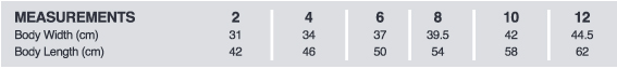 Body Width (cm) | 31 | 34 | 37 | 39.5 | 42 | 44.5 | 47 | 49.5 |